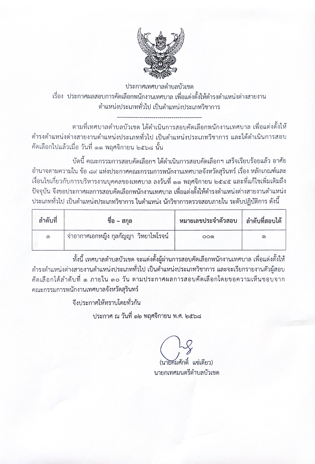 ประกาศเทศบาลตำบลบัวเชด เรื่อง ประกาศผลสอบการคัดเลือกพนักงานเทศบาล เพื่อแต่งตั้งให้ดำรงตำแหน่งต่างสายงาน ตำแหน่งประเภททั่วไป เป็นตำแหน่งประเภทวิชาการ