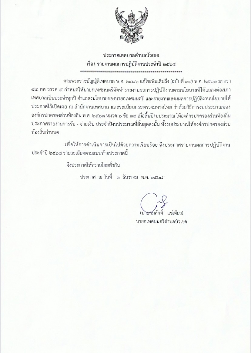 ประกาศเทศบาลตำบลบัวเชด เรื่อง รายงานผลการปฏิบัติงานประจำปี 2568